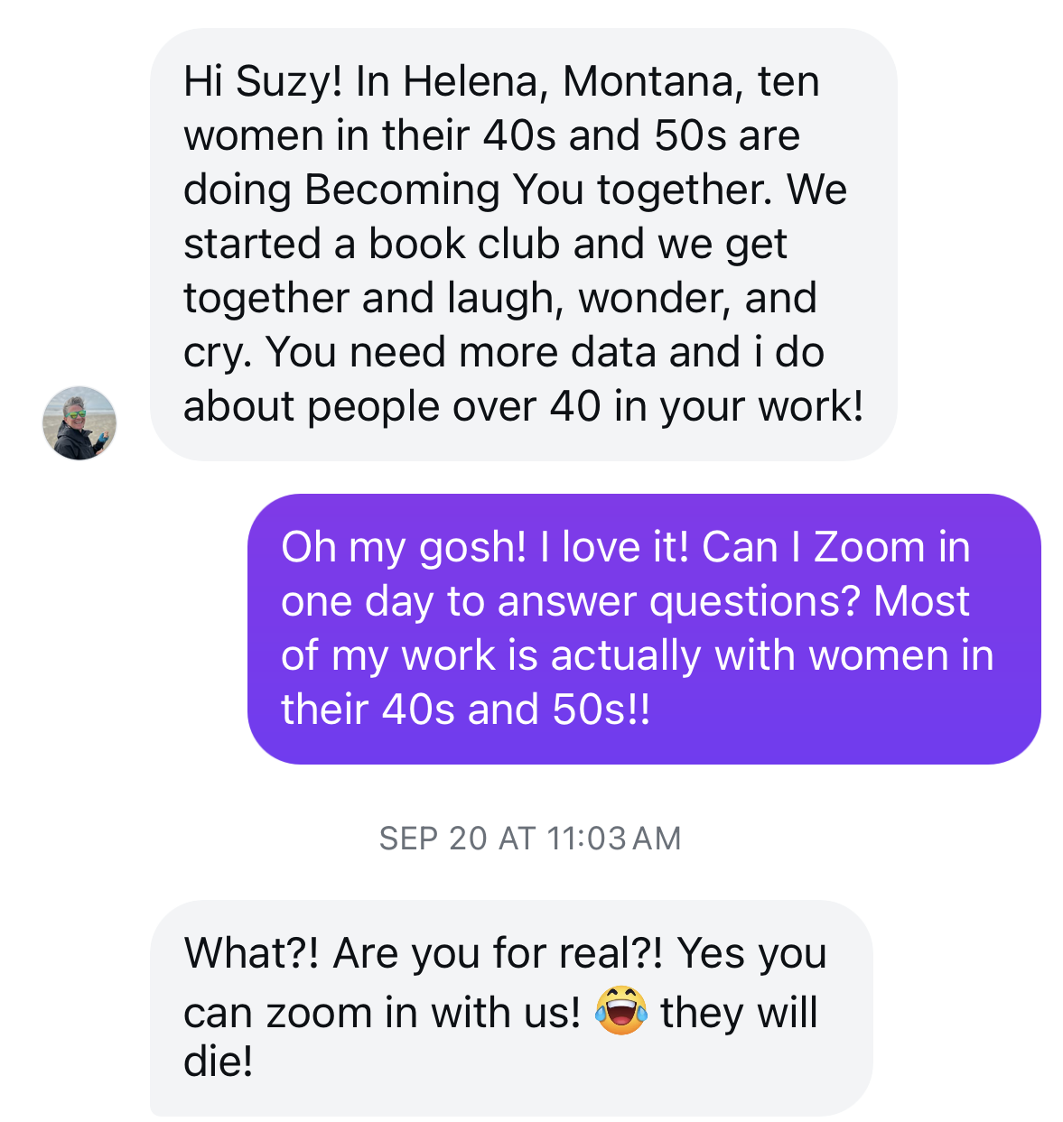 I love the way Becoming You brings people together! Also this week, I watched in wonder as granddaughter Kim Murstein and grandmother Gail Rudnick, the power duo behind “Excuse My Grandma,” lovingly sorted out their differences with The Values Bridge as their guide. For a minute there, I forgot we were taping a podcast. Their conversation was that vulnerable, tender, and revelatory. If you get a chance to listen, wait for the moment when Kim admits she wishes she had more agency, and Gail suddenly and totally somehow gets it.